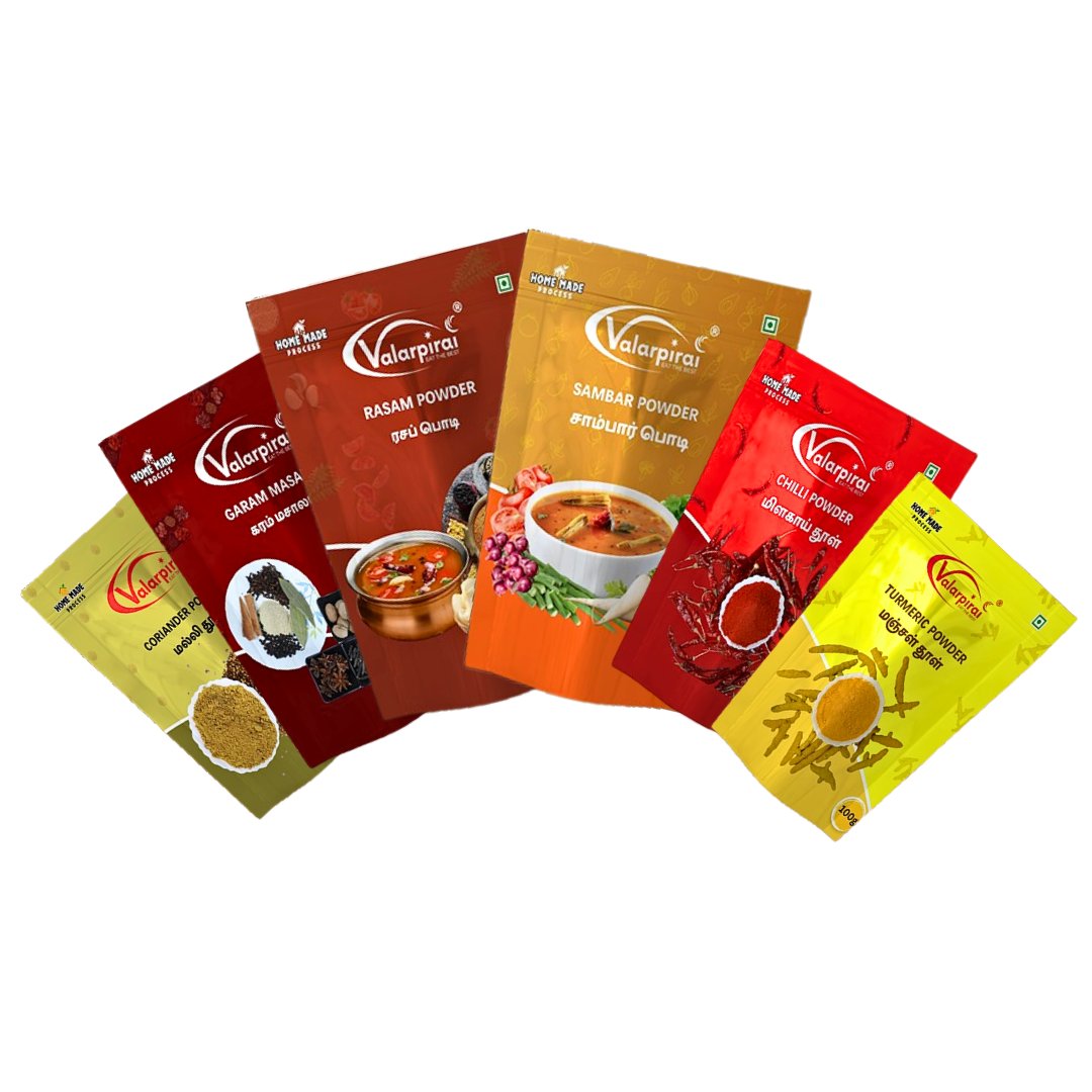 At Valarpirai Foods, our journey began with a simple dream – to bring back the authentic taste of traditional home-cooked food through pure and aromatic masala powders. What started as a small-scale effort in our hometown with limited resources has now grown into a trusted brand loved by families across regions. From handpicking the finest spices to carefully roasting and grinding them, we stayed committed to purity, quality, and tradition at every step.